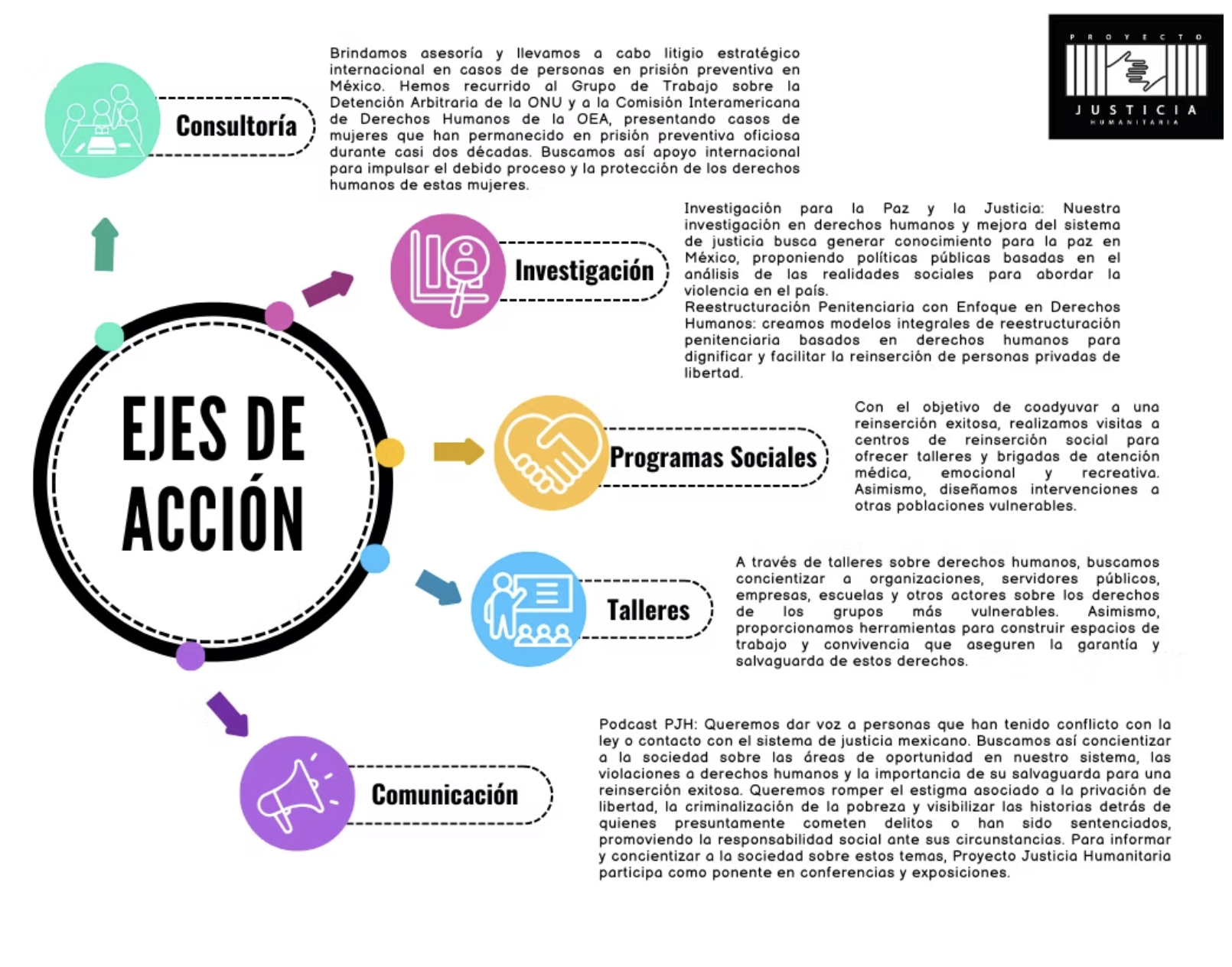 Proyecto Justicia Humanitaria (PJH) nace con el objetivo de promover la construcción de la paz en México a través de la justicia basada en los derechos humanos y la dignidad, buscando la reforma integral del sistema. Creemos que salvaguardar los derechos humanos, es fundamental para formar un camino hacia una sociedad sin violencia. Para ello, impulsamos la prevención del delito, la reinserción social efectiva con un enfoque correctivo y de acompañamiento en lugar de uno meramente punitivo, abordando las carencias del sistema de justicia y los estragos del proceso penal en las personas, con el fin de restablecer el tejido social y construir un México más justo y pacífico a largo plazo.